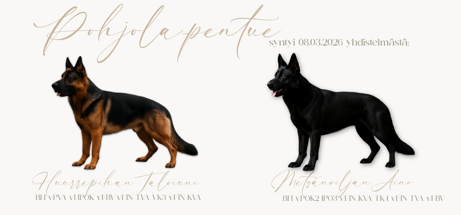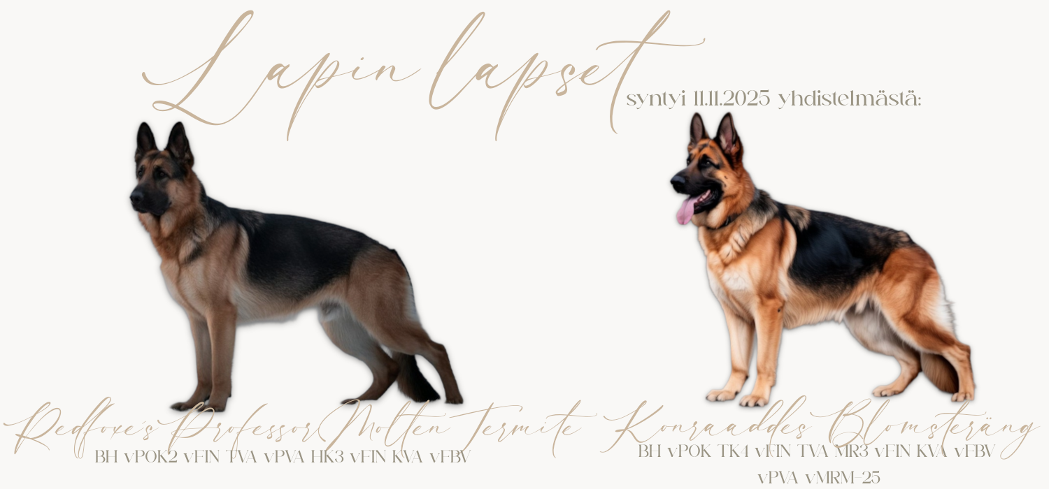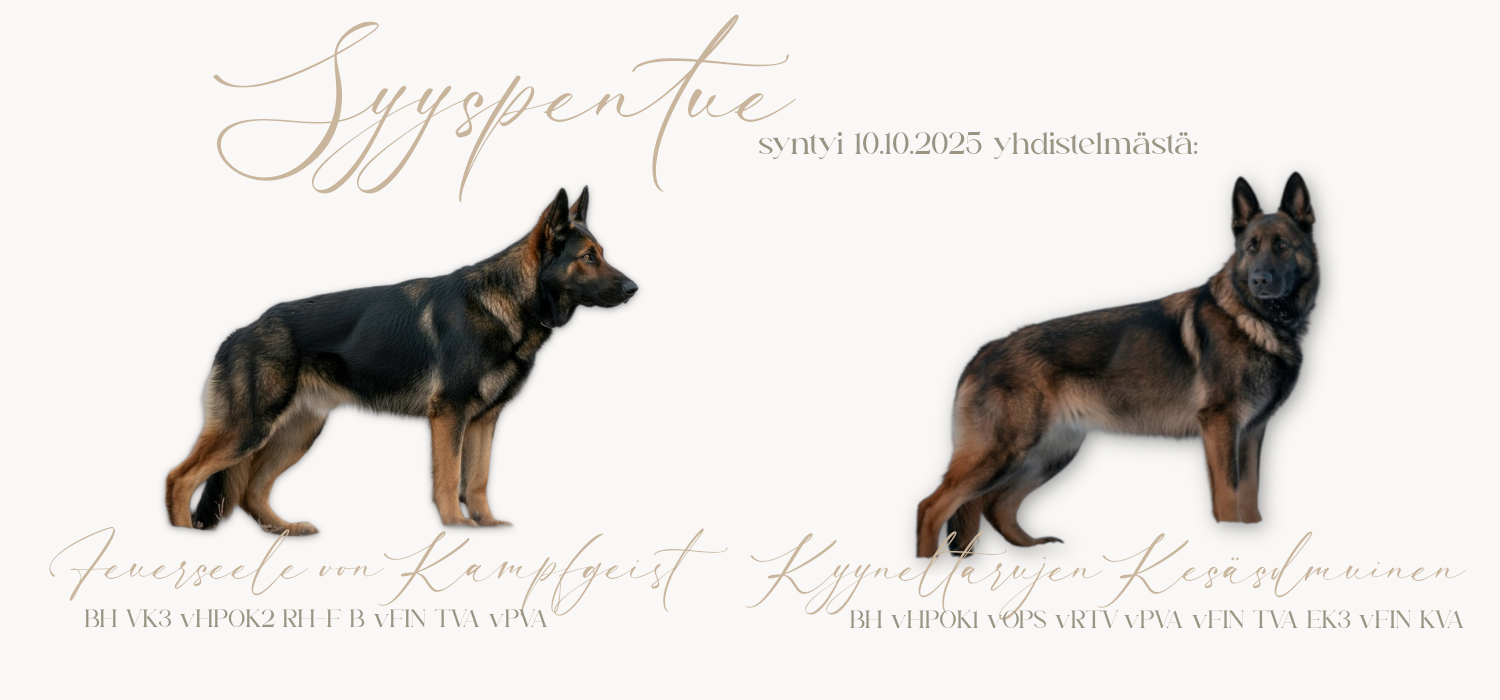 Ajatus Untuvaisen ensimmäisestä pentueesta syntyi jo loppukeväästä 2025. Ajankohta ei kuitenkaan tuolloin ollut vielä sopiva, mutta ajatus- ja selvitystyö alkoi tuolloin. Pentueen isäksi valikoitui uros Feuerseele von Kampfgeist eli Repe, jolla oli jo jonkin verran kilpailutaustaa. Emäksi valittiin upea paimenneito, Kyyneltarujen Kesäsolmuinen eli Solmu. Ja kas näin, täydellinen yhdistelmä oli löytynyt!